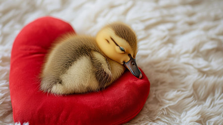 little duckling sleeping on the heart-shaped pillow, top view, close-up.