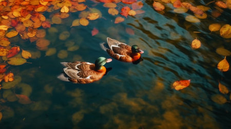 Ducks gliding gracefully on a serene autumn lake, surrounded by golden foliage, offering a picturesque image with copy space