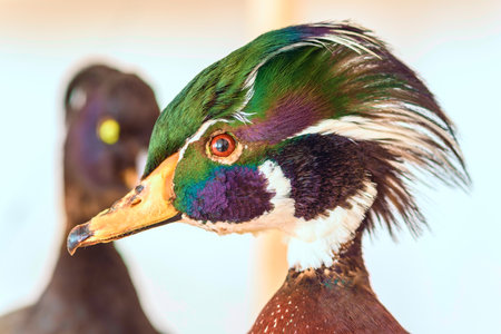 A wood duck bird portrait. Blurry background. Generative AI.