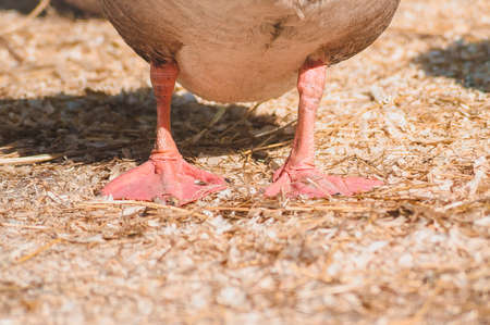 The red paws of a goose stand on a warm floor of sawdust. Keeping poultry on the farm