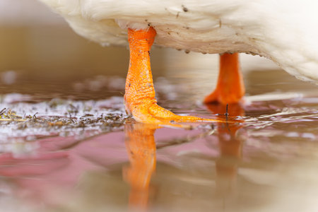 White ducks legs elegantly stand atop a moist ground, exuding peace and tranquility in their surroundings.