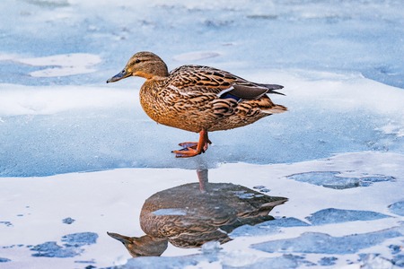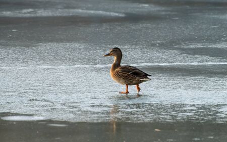 Duck on the ice of a lake in winter.