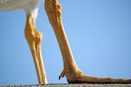 Close up view of the orange leg of a seagull bird.