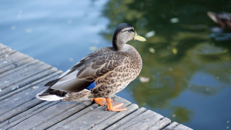 Close-up of an adult female wild mallard duck stands on the shore of a lake in a park in summer. selective focus.