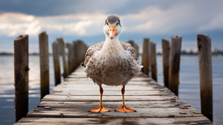 a gray bird with a strong facial expression stands at the end of a pier, captured in the style of comical choreography. this tabloid photograph showcases the unique duckcore aesthetic, with its white and orange coloration. the wide-angle lens of the pentax 645n camera adds depth to the image. ai generated