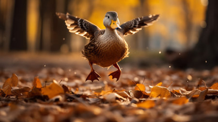 a playful and characterful duck gracefully soars through a forest, its wings outstretched, as golden light filters through the trees. the fallen leaves create a vibrant backdrop, adding to the lively movement portrayed in this uhd image. this photograph captures the essence of the dusseldorf school of photography, with its emotive body language and fun imagery, showcasing the artistry of characterful animal portraits. ai generated