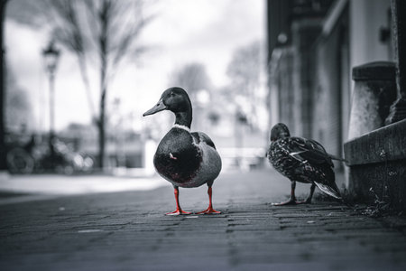 Ducks on the street in Amsterdam, Netherlands. Black and white photo.