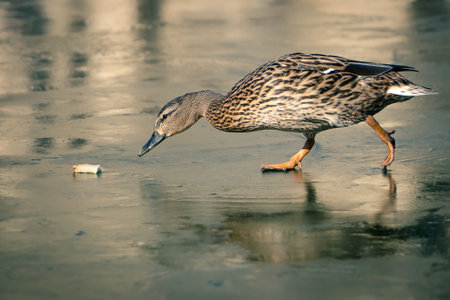 Mallard duck walks gracefully across a frozen lake during winter in a serene landscape