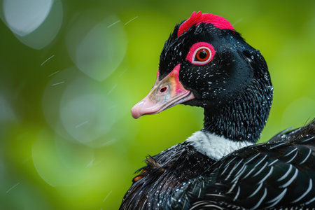 Graceful Black Muscovy duck in green field. Bird with dark feathers in outdoor green grass. Generate ai