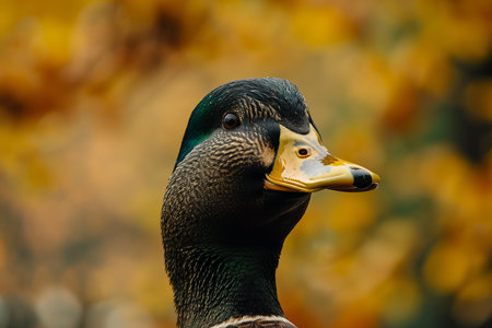 Detailed image showcasing a male mallard duck against a vibrant autumn backdrop