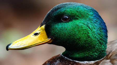 This stunning close-up captures the vibrant colors of a male Mallard duck, showcasing its distinctive green head and bright yellow bill in nature.