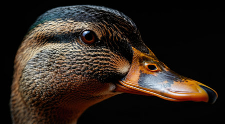 Close-up portrait of a duck with dark background