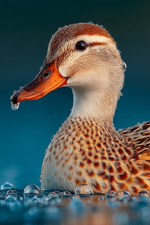 A detailed portrait of a female duck, showcasing its speckled feathers and glistening water droplets, set against a soft blue background.