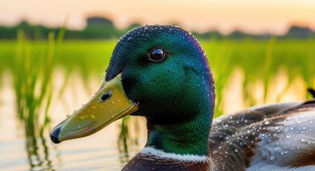 Close-up of a male mallard duck with iridescent green feathers and blurred water background. Wildlife and nature beauty concept