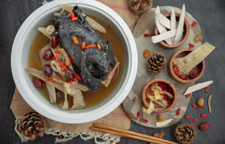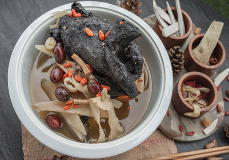 Chinese traditional nourishing health stew, stewed black bone chicken, Chinese black chicken soup, This soup very famous among chinese food and asian food as a healthy soup, food as medicine. Oblique view from the top.
