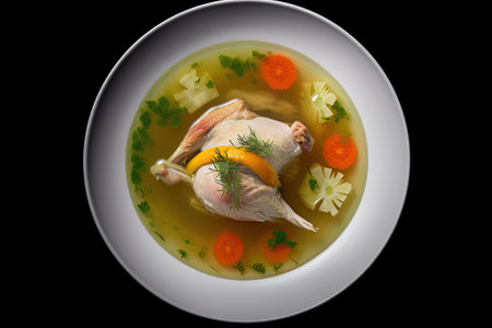 Chicken Soup, White Bouillon with Vegetables, Homemade Meat Broth Bowl, Chicken Soup Top View, Abstract Generative Ai Illustration