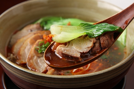 Traditional Chinese noodles in soup with vegetables.
