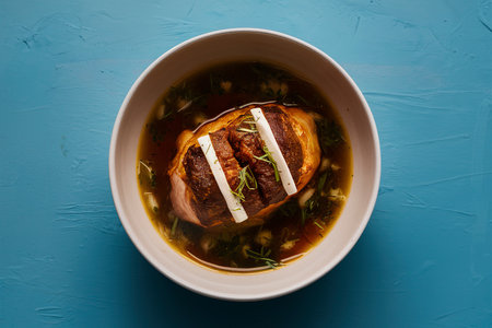 AI Generated. A bowl of beef and vegetable soup with basil on top