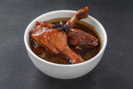 Ped Pa Lo, brown Chinese stewed calf of duck leg in white bowl on dark texture background, Thai food