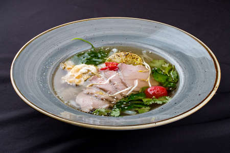 Fish soup is a traditional dish for coastal residents. Home cooking or culinary background abstract. Homemade dish.