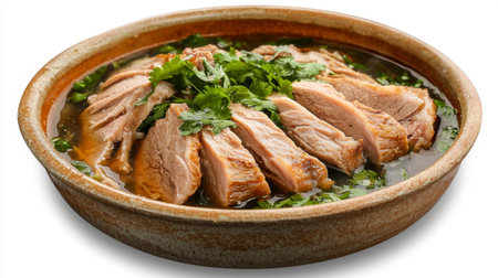 A beautifully arranged slow-cooked meat dish garnished with fresh herbs, served in a rustic bowl. Perfect for food photography, recipes, and culinary exploration.