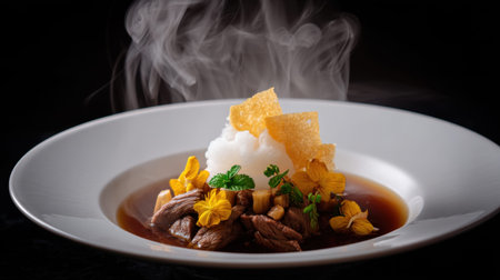 This elegant dish showcases a beautifully plated meal with steam rising, featuring tender meat, vibrant herbs, and crispy garnishes, perfect for gourmet dining.