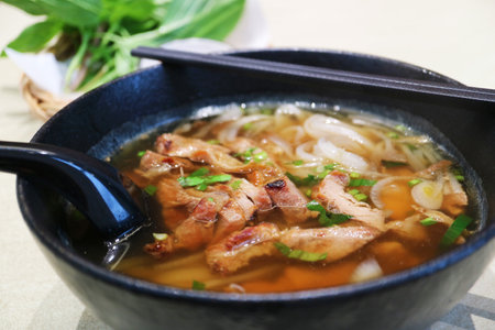 Closeup of Mouthwatering Vietnamese Pho Topped with Grilled Pork