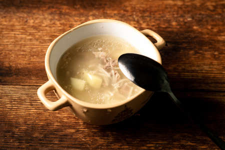 Chicken soup on wooden background.