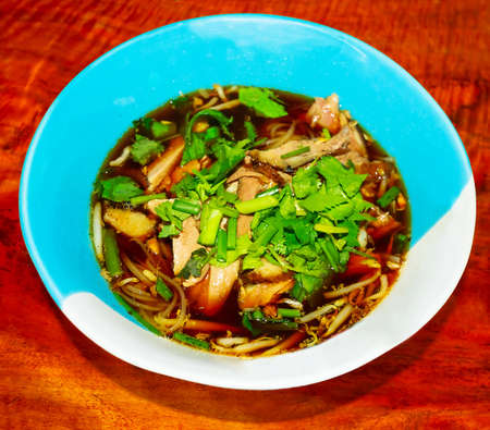 Duck noodles in the bowl with a spoon and chopsticks isolated on wooden wallpaper background closeup.