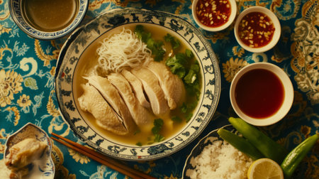 A beautifully arranged chicken noodle soup featuring tender chicken, fresh herbs, and assorted condiments. Perfect for showcasing vibrant cuisine.