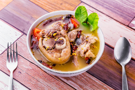 Spicy soup with pork leg on dark wooden background