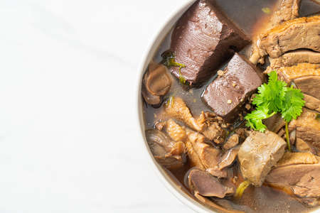 thai breakfast from pork soup in white bowl