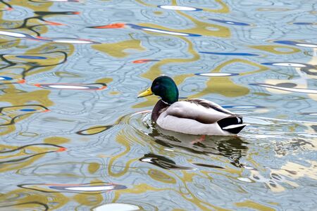 Mallard duck on river water on a sunny day with reflections in the water. The duck swims on the surface of the water.