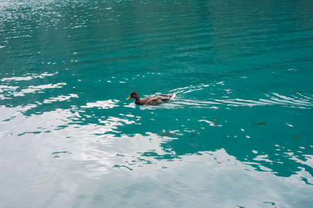 A beautiful brown wild duck is swimming in the clear blue waters of the river. The wildlife and reservoirs are beautiful.