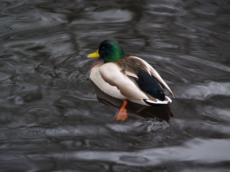Mallard Duck isolated in the water. Dark moody colours from a Mallard duck isolated in a pond alone.