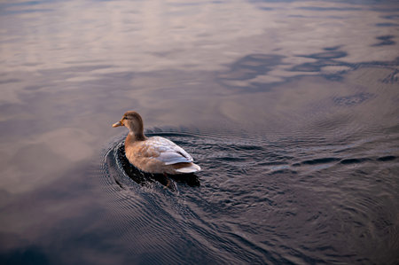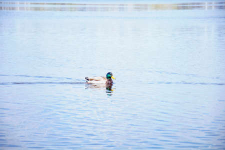One duck swimming in a pond, spring sunny day, Close up, female on water, birds and animals in wildlife, selective focus, Adult duck in full breeding plumage, enjoying a beautiful day