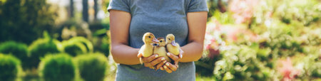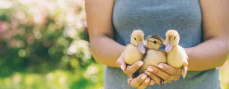 a female farmer holds a duckling in her hands