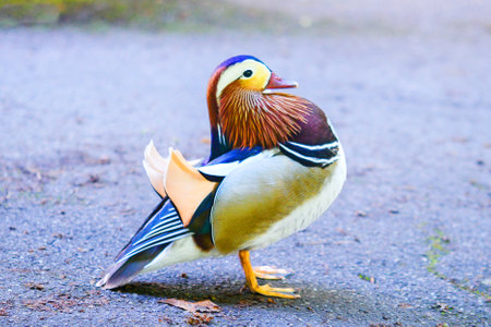A wild mandarin duck walking through the park. High quality photo