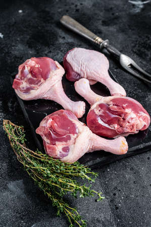 Uncooked Raw Duck legs drumsticks on marble board. Black background. Top view