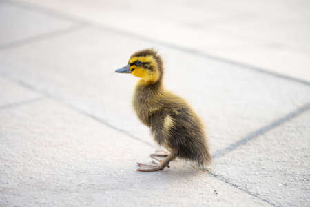 A close up portrait of a small tine baby duck or duckling wobling and walking on a concrete road. The cute little chick was running behind its mother.