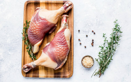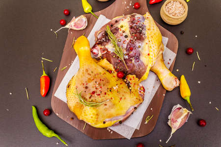 Raw duck legs. Fresh BIO ingredient for preparation traditional French confit. Spice, vegetable, herbs. Animal proteins and healthy fats, wooden board, stone background top view close up
