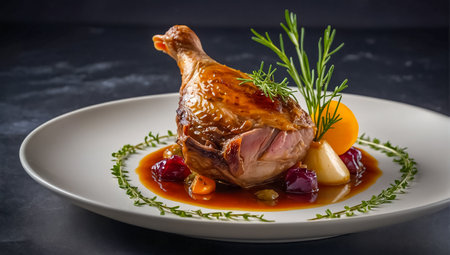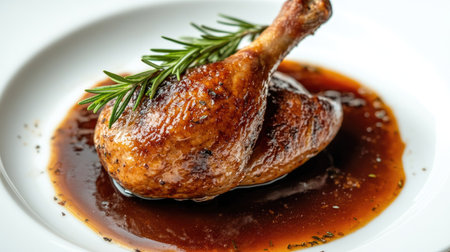 Elegant presentation of duck confit with tender duck legs, garnished with rosemary and served alongside a rich sauce, set against a light background. -