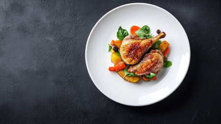 Crispy duck confit served with vegetables on a white plate, placed on the lower third, with ample space above for copy. Perfect for culinary websites or ads.
