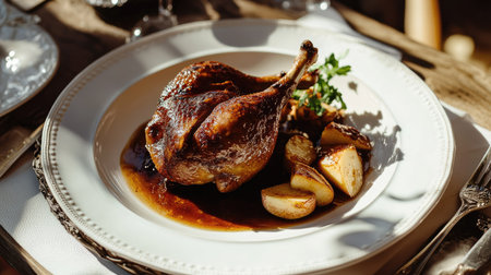 Closeup of a roasted duck confit leg paired with baked apple and gravy on a white plate, illuminated by soft sunlight, creating a warm and inviting summer dining scene