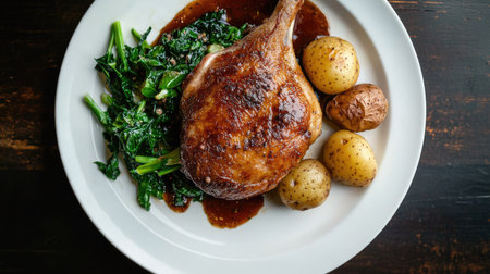 A succulent duck confit leg with a crisp brown exterior, viewed from above on a white plate, with sides of greens and potatoes, served on a dark wooden surface.