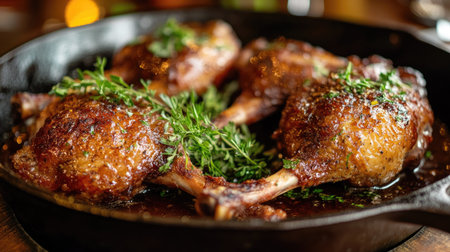 Closeup of duck confit with golden-brown legs, garnished with fresh herbs and served in a cast-iron skillet, showcasing the dish's rich textures and flavors.