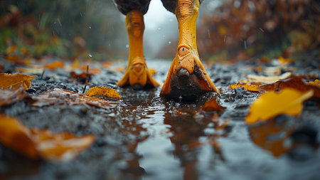 Close-up of a goose walking in a puddle with autumn leaves