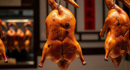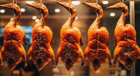 Roast duck in the shop window of a restaurant in Beijing, China