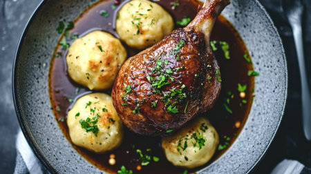 A beautifully baked duck leg served with dumplings, garnished with fresh herbs and drizzled with a rich sauce. The textures are perfectly captured.