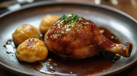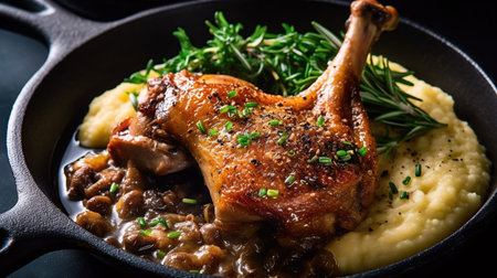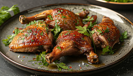 Closeup of succulent duck confit with a rich golden crust, plated with fresh herbs and served in a traditional French dish, ideal for culinary blogs.